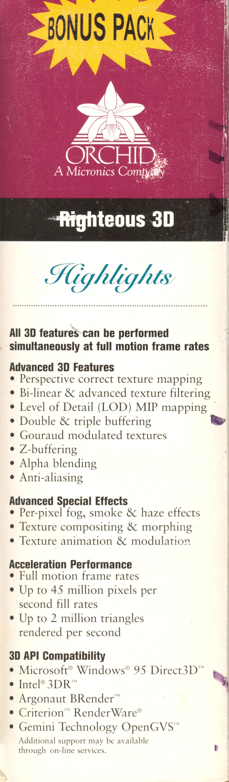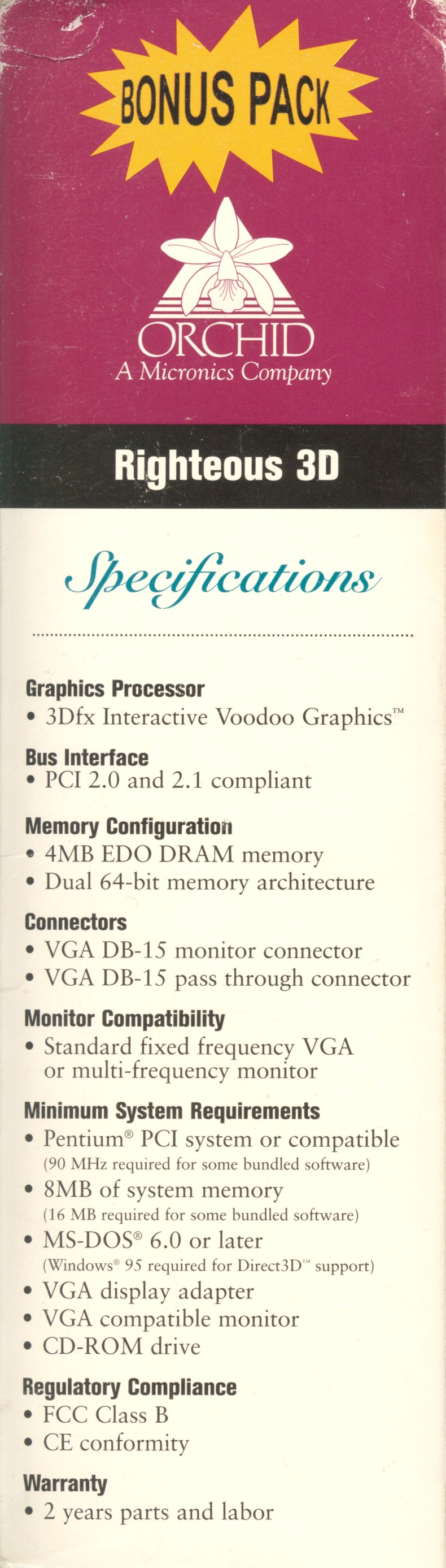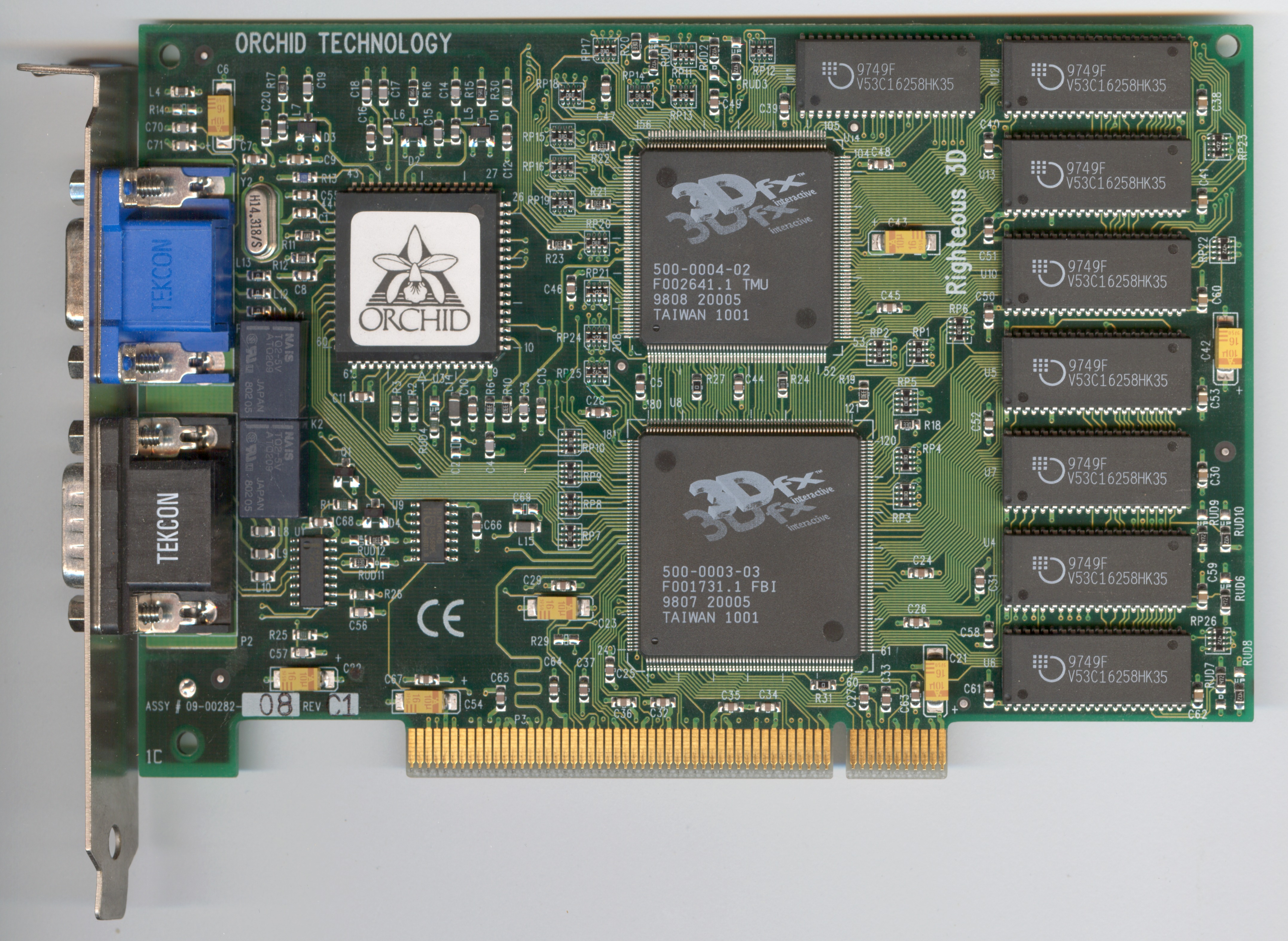 Orchid Righteous 3D Published: 31st July 2012 (last update 29th December 2016 ) Compare to fastest reference SST1 board Add to compare GPU GPU type SST1 Manufacturing process500 nm Transistors1 million Die size135 mm2 Density0.007 M / mm2 ROPs1 TMUs1 Pixel shaders- Vertex shaders- Unified shaders- Clock50 MHz Pixel fillrate50 MP/s Texel fillrate50 MT/s SP gigaflops- DP gigaflops- DirectX5 OpenGL1.1 OpenCL / Compute ver.- Memory Capacity4 MB TypeEDO Clock50 MHz Bus width128 bit Bandwith800 MB/s Rated speed50 MHz BrandMosel The card ManufacturerOrchid InterfacePCI Interface bandwith133 MB/s TDP- Analog I/O ports1 × VGA Digital I/O ports- Independent screens1 Manufacture date8th week of 1998 Release date1996 Orchid Righteous 3D (front side) Orchid Righteous 3D (back side) SST1 GPU A-Trend AA2465 Black PCB InnoVision 3DX5000TV Gainward Dragon 1000 Voodoo architecture 3dfx Voodoo3 2000 PCI SDR PowerColor EvilKing Creative CT6670 (old PCB) Orchid Righteous 3D gallery Orchid Righteous 3D gallery Orchid Righteous 3D gallery Orchid Righteous 3D gallery Orchid Righteous 3D gallery