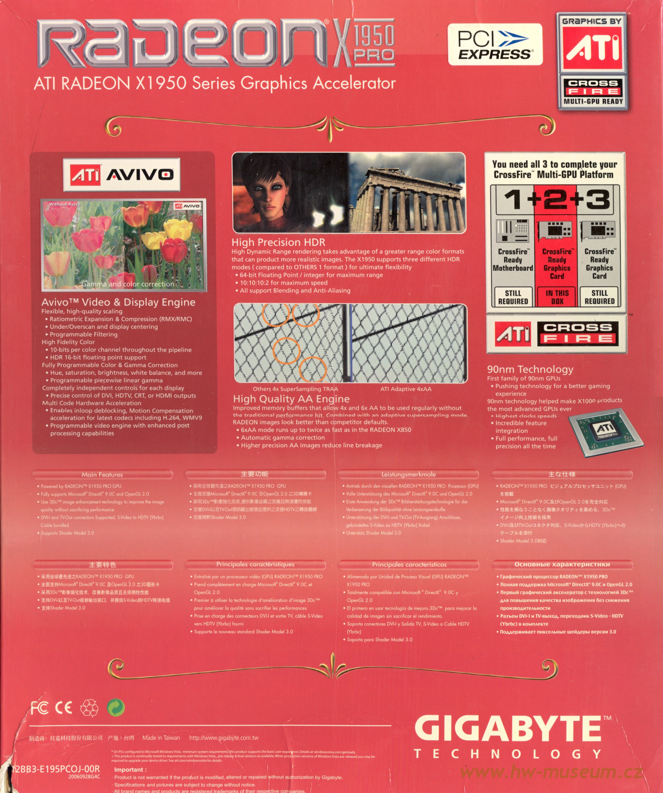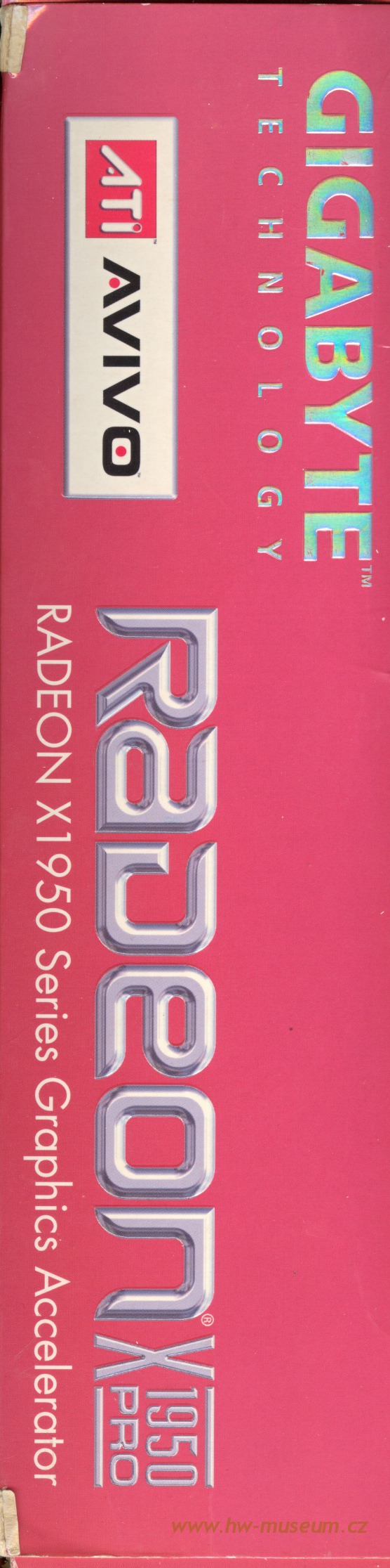 Gigabyte Radeon X1950 Pro Published: 15th June 2014 (last update 1st January 2017 ) Compare to fastest reference RV570 board Add to compare GPU GPU type RV570 Manufacturing process80 nm Transistors330 million Die size230 mm2 Density1.43 M / mm2 ROPs12 TMUs12 Pixel shaders36 Vertex shaders8 Unified shaders- Clock575 MHz Pixel fillrate6 900 MP/s Texel fillrate6 900 MT/s SP gigaflops- DP gigaflops- DirectX9c OpenGL2.0 OpenCL / Compute ver.- Memory Capacity256 MB TypeGDDR3 Clock1 380 MHz Bus width256 bit Bandwith44 160 MB/s Rated speed- Brand- The card ManufacturerGigabyte InterfacePCI-E x16 Interface bandwith4 096 MB/s TDP80 W Analog I/O ports1 × S-Video out, 2 × DVI-I Digital I/O ports2 × DVI-I Independent screens2 Manufacture date- Release date2006 Gigabyte Radeon X1950 Pro (front side) Gigabyte Radeon X1950 Pro (back side) RV570 GPU Gigabyte Radeon X1950 Pro R5xx architecture ATi All in wonder 2006 (Radeon X1300) HIS Radeon X1900 CrossFire Edition Gigabyte Radeon X1950 Pro Gigabyte Radeon X1950 Pro gallery Gigabyte Radeon X1950 Pro gallery Gigabyte Radeon X1950 Pro gallery